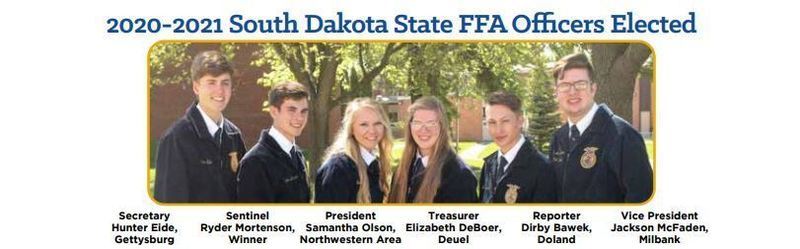 To wrap up the 92nd South Dakota State FFA Convention, six members were elected to serve as the 2020-2021 South Dakota State FFA officer team and two members were elected to serve as the 2020-2021 South Dakota State FFA ambassadors. Candidates vied for the six South Dakota leadership roles and went through extensive interviews. The individuals elected to the South Dakota State FFA officer team will travel across the state throughout the next year presenting speeches, facilitating workshops, hosting camps, holding conferences and conducting business for the South Dakota FFA Association. They will also represent the state of South Dakota at the National FFA Convention. When asked about their year of service, they shared, “We didn't start the year in a traditional way, or as planned; however, this unique experience has prepared our officer team to take on any challenge that we may encounter. We are very excited to be able to represent South Dakota FFA and continue sharing the importance of agricultural education."